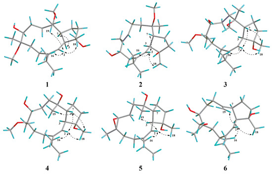 The HRESIMS ion peak at m/z 345.2398 (calculated as 345.2400 for C20H34O3Na, [M + Na]+) revealed the molecular formula of sarcocrassolin E (5) to be C20H34O3 with four indexes of hydrogen deficit. The existence of hydroxy and olefinic groups could be determined by the characteristic infrared absorption bands at 3393 and 1650 cm−1, respectively. The 13C NMR spectrum revealed twenty carbon signals, which were classified by DEPT and HSQC spectra and then attributed to four quaternary carbons, five methines, six methylenes and five methyls. One double bond and one epoxy ring were composed of two methines, C-2 (δC 120.4, δH 5.31) and C-11 (δC 61.7, δH 3.16), as well as two quaternary carbons, C-1 (δC 146.5) and C-12 (δC 60.1), which contributed to the two indexes of hydrogen deficit. The remaining two indexes of hydrogen deficit thus revealed that the molecule contained two rings. Following that, the entire planar structure of 5 could be constructed using the 2D NMR data as depicted in Figure 2. When the NMR data were further analyzed, it became clear that compound 5 and sarcophytrol B [7], a capnosane-type macrocyclic diterpene that had previously been identified, were highly similar. The major difference was the configuration of double-bond Δ1. In fact, that had an E configuration in 5 and Z configuration in sarcophytrol B, which was established by the ROESY cross peaks between H-2 and H3-16 in compound 5. It was also possible to establish the relative configurations of C-3, C-4 and C-7 as 3S*, 4S* and 7R*, respectively, by the similar key ROESY cross peaks observed in compounds 4 and 5. Consequently, four possible isomers 5a–5d (Figure S59) were calculated. Based on the experimental results, the NMR data of compound 5 provided the highest degree of matching for 5d (3S*, 4S*, 7R*, 8S*, 11S*, 12R*), with 100% probabilities. Consequently, the relative configuration of 5 was defined as 3S*, 4S*, 7R*, 8S*, 11S* and 12R* (Figure 1).