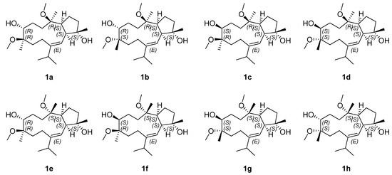 The significant ROESY cross peaks between H-2 (δH 5.02) and H3-16 (δH 1.08) indicated the double-bond Δ1 in 1 in E-geometry. The ROESY cross peaks between H-3 (δH 2.49)/H-7 (δH 2.88), H-2 (δH 5.02)/H3-18 (δH 1.10), H-2 (δH 5.02)/H3-19 (δH 1.07) and the absence of ROESY correlation between H-3 (δH 2.49)/H3-18 (δH 1.10), H-2 (δH 5.02)/H-7 (δH 2.88), H-2 (δH 5.02)/H-3 (δH 2.49) indicated that H-3 and H-7 were at the same side and arbitrarily assigned as being in α-configuration, whereas H3-18 and H3-19 were assigned as being in β-configuration (Figure 3). The ROESY experiment did not allow for determining the relative configuration of C-8, C-11 and C-12 due to the presence of a highly flexible macrocycle. As a result, QM-NMR employing DP4+ probability analysis was carried out. This is a potent tool whose application for capnosane-type diterpenes has been proven to be reliable [3]. QM-NMR calculations on eight potential isomers 1a–1h (Figure 4) were then performed. According to the experimental results, the NMR data of compound 1 offered the highest degree of matching for 1g (3S*, 4S*, 7S*, 8S*, 11S*, 12S*) (DP4+ probability 99.81%). Therefore, the 8S* configuration was consistent with the correlations observed in the ROESY spectrum. Finally, the structure of compound 1 was determined by the analysis presented above and represented in Figure 1.