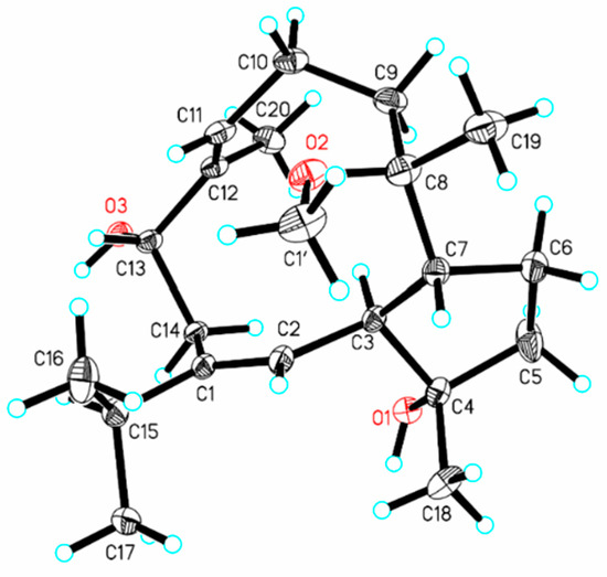 Sarcocrassolin B (2), isolated as a colorless crystal, had a molecular formula of C21H36O3 according to its HRESIMS data at m/z 695.5211 (calculated as 695.5221 for C42H72O6Na, [2M + Na]+), with four degrees of unsaturation. Additionally, the characteristic infrared absorption bands at 3421 and 1602 cm−1 provided evidence for the presence of hydroxyl and olefinic groups. The 1H NMR data revealed the signals of five methyl groups (δH 1.06, 1.07, 1.08, 1.15, 1.69), one methoxy group (δH 3.12) and two olefinic protons (δH 5.00, 5.38). The 13C NMR data showed the presence of 21 signals, which comprised two pairs of olefinic carbons, five methyl signals, five methylene signals, four sp3 methines, two sp3 quaternary carbons and one methoxy carbon. Based on a comprehensive analysis of its NMR spectra, compound 2 almost resembled trocheliophol G, a capnosane-type macrocyclic diterpene from S. trocheliophorum [6]. The major difference was observed at the C-13 and C-14 positions, where a hydroxy at the C-13 position in 2 shifted to the C-14 position in trocheliophol G. The significant HMBC cross peaks from H3-20 (δH 1.69) to C-11 (δC 127.9)/C-12 (δC 134.3)/C-13 (δC 76.2), and from H-2 (δH 5.00) to C-14 (δC 38.3) as well as the 1H-1H COSY cross peaks of H-13 (δH 3.97)/H-14a (δH 1.97) and H-13 (δH 3.97)/H-14b (δH 2.80), further supported this conclusion. The ROESY spectrum verified the E configurations of the double-bonds Δ1 and Δ11, with the essential cross peaks of H-2 (δH 5.00)/H3-16 (δH 1.08) and the lack of H-11 (δH 5.38)/H3-20 (δH 1.69). In addition, the key ROESY cross peaks of H-2 (δH 5.00)/H3-18 (δH 1.06) and H-2 (δH 5.00)/H-7 (δH 2.15), along with the lack of cross peak of H-2 (δH 5.00)/H-3 (δH 2.34) indicated that H-7 and H3-18 were co-facial, while H-3 was on the opposite side of the molecule (Figure 3). The relative configuration of C-8 and C-13 could not be established from the ROESY experiment either. However, an appropriate single crystal of compound 2 was obtained in a solution of MeOH/H2O (20:1). Ultimately, as shown in Figure 5, the absolute configuration of 2 was obtained by analyzing the X-ray crystallographic data (Flack parameter: −0.3(4)) and was unambiguously established as 3S, 4S, 7R, 8R, 13S.