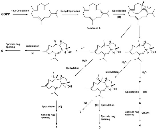 Because all compounds 1–7 possessed the same 5/11-fused bicyclic carbon skeleton and were obtained from the same animal material, it was reasonable to assume that they originated from the same biosynthetic pathway. According to their structural characteristics, a potential biosynthetic pathway of compounds 1–7 has been postulated (Scheme 1). The precursor geranylgeranyl diphosphate (GGPP) via 14,1 cyclization and dehydrogenation generates intermediate cembrene A. Subsequently, the 5/11-fused bicyclic carbon skeleton was generated by epoxidation and transannular cyclization from cembrene A. Finally, all compounds 1–7 were obtained after undergoing a series of reactions (such as methylation, epoxidation and dehydrogenation).