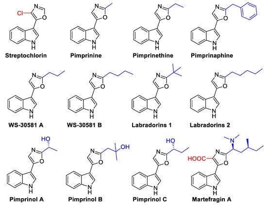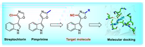 Natural products are well known as one of the most important sources for lead discovery in medicinal and agricultural chemistry, because their novel scaffolds can afford an opportunity to discover novel candidates with different modes of action from the existing agents. Streptochlorin is a marine natural product with the structure of 4-chloro-5-(3-indolyl)oxazole; it has been reported to display a range of biological activity [1,2,3,4]. Pimprinine is an indole alkaloid produced by many species of Streptomyces, first isolated from the filtrates of Streptomyces pimprina cultures in 1963 [5,6]; it is a monoamine oxidase (MAO) inhibitor. Both of these natural products belong to the class of naturally occurring 5-(3′-indolyl)oxazoles, and compounds of this family, including Pimprinethine; Pimprinaphine; WS-30581 A and B; Labradorins 1 and 2; Almazole A, B, and C; and Martefragin A, exhibit a wide range of potent biological activities [7] (Figure 1), such as anti-angiogenesis [3], antibiotic [8], anticancer [1], anti-cell proliferation [9], antioxidant [10], and antiviral activity [11,12]. Bioassay conducted at Syngenta showed that streptochlorin and pimprinine are also promising antifungal substances demonstrating good bioactivity against many phytopathogens [13,14,15,16]; for example, streptochlorin displayed excellent antifungal activity against Pythium dissimile, Botrytis cinerea, Zymoseptoria tritici, Pyriculariaory zae, Fusarium culmorum, and Rhizoctonia solani in artificial media. Meanwhile, these compounds lack potency at lower concentrations, rarely warranting further study.