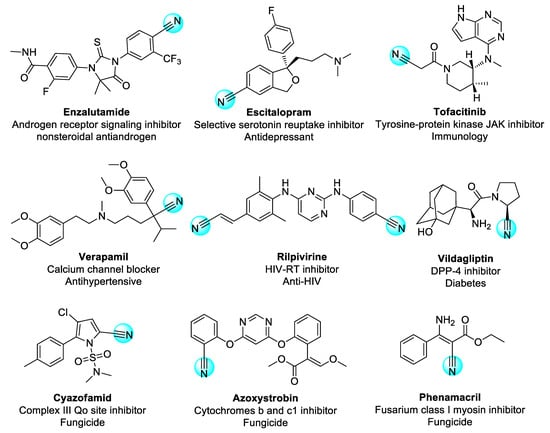 In classical medicinal chemistry, the nitrile group was commonly considered as bioisosteres of carbonyl, hydroxyl, and carboxyl groups, as well as halogen atoms [17]. As nitrile-containing drugs account for 2.4% of the 2327 approved small-molecule drugs according to the DrugBank database by 2018 [18], the presence of the nitrile group in the structure of compounds is a very common feature of drug molecules [19,20], such as Enzalutamide, a hormone treatment that blocks testosterone from reaching prostate cancer cells [21], Escitalopram, a medication used in the management and treatment of major depressive disorder and generalized anxiety disorder [22]; Tofacitinib, as an oral JAK3 inhibitor to treat adults with moderately to severely active rheumatoid arthritis [23]; Verapamil, a medication for treating hypertension, angina, and certain heart rhythm disorders [24]; Rilpivirine, a non-nucleoside reverse transcriptase inhibitor that inhibits the replication of HIV-1 [25]; and Vildagliptin, an orally administered dipeptidyl peptidase-4 (DPP-4) inhibitor for treating diabetes [26]. Meanwhile, Cyazofamid is a novel fungicide exhibiting specific activity against diseases caused by Oomycetes [27]; Azoxystrobin is a broad-spectrum β-methoxyacrylate fungicide that was first introduced in 1998, which inhibits mitochondrial respiration by binding to the Qo site of the cytochrome bc1 complex [28,29]; and Phenamacril is a Fusarium-specific fungicide used for Fusarium head blight management [30,31]. (Figure 2).