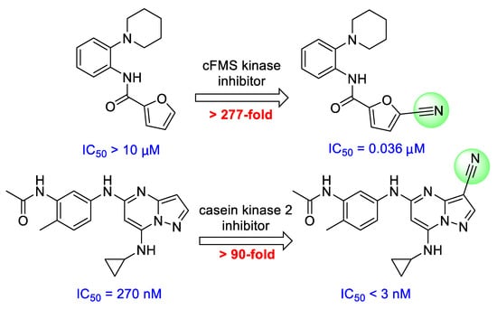 Introducing the nitrile group into the molecules is an effective protocol for structural optimization (Figure 3). For example, the nitrile-containing structure exhibited a 277-fold improvement in potency over the non-substituted structure as selective inhibitors of cFMS. For casein kinase 2 (CK2) inhibitor, the nitrile-containing structure improved binding affinity more than 90-fold compared with the non-substituted structure, and the nitrile group was engaged in hydrogen bond interactions with the conserved water molecules in a cocrystal structure (PDB Code: 5H8B) [17].