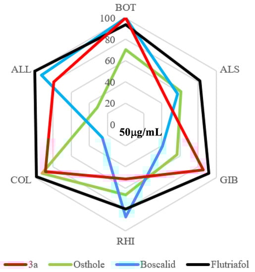 As compounds 3a, 3b, 3g, and 3h exhibited relatively good antifungal activity in primary screening; EC50 values of them and commercial fungicides Boscalid and Carbendazim were further determined (Table 2). The most active compound 3a was compared with Osthole, Boscalid, and Flutriafol in the radar chart shown in Figure 6, and its antifungal activity against four kinds of fungi was more active than at least one of the positive controls.