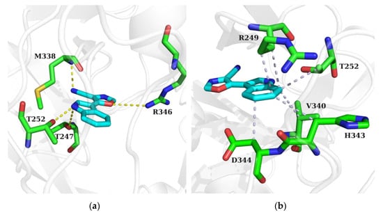 The simulated binding models indicated that compound 3a formed hydrogen bonds and hydrophobic interactions with the amino acid residues. The nitrile group of 3a formed a hydrogen bond with residue Met338, the indole N-H bond formed hydrogen bonds with Thr247 and Thr252, and the oxazole ring formed a weak hydrogen bond with Arg346. The indole ring formed hydrophobic interactions with Arg249, Thr252, Val340, His343, and Asp344 (Figure 7).