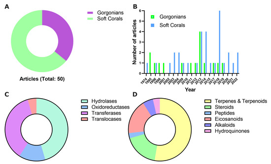 Distribution of the reviewed enzyme inhibitors isolated from soft corals and gorgonians. Inhibitors were classified according to their organism of origin (A), publication date (B), principal classes of targeted enzymes (C), and molecular structure (D).
