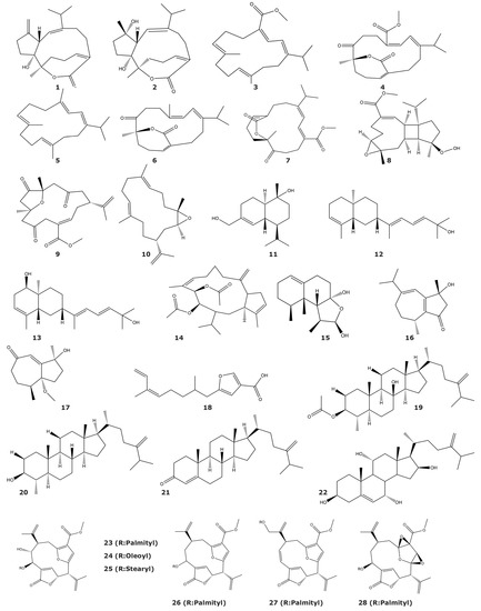 Casitas B-lineage lymphoma proto-oncogene B (Cbl-b) is an E3 ubiquitin ligase that acts as an important regulator of the immune response [125]. Targeting this enzyme is a promising approach for the treatment of autoimmune diseases and cancer [126,127]. The Sinularamides A−G (107−113), isolated from the soft coral Sinularia sp., are a group of diterpenoids that inhibits Cbl-b enzyme [122]. The most potent of these compounds was the sinularamide C (109), displaying an IC50 value in the low micromolar range (Table 8 and Figure 9).
