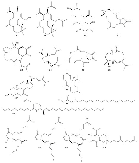 Three prostaglandins (41–43) with inhibitory activity against elastase were isolated from the gorgonian Plexaura homomalla (Table 3 and Figure 3) [60]. These compounds showed similar potency, in terms of inhibition, in the kinetic assays performed in this study, but no IC50 or Ki values were reported. Based on the results of the kinetics assays, it seems that the presence of the carboxyl group is essential for elastase inhibition, since the molecules with an acetyl ester in this position showed no inhibition on the enzyme [60].