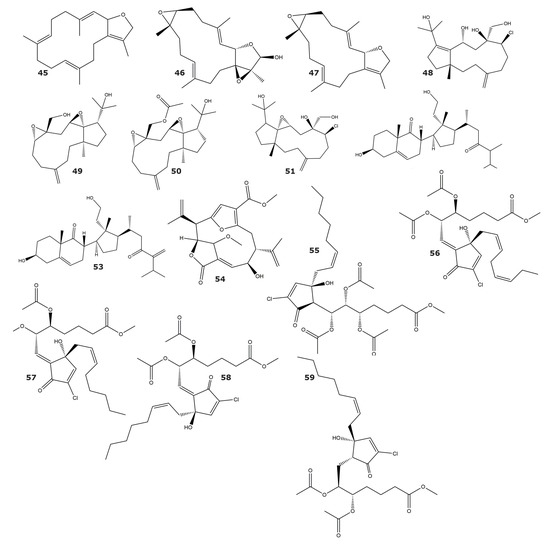 The ubiquitin–proteasome system plays a critical role in the maintenance of proteome homeostasis. Therefore, proteasome is considered an important target for the development of drugs for the treatment of diseases such as neurodegenerative disease, immune-related disease, and cancer [69]. Several inhibitors of the ubiquitin–proteasome system have been identified using a cell-based, high-content assay based on the measurement of aggregations of ubiquitinated proteins. Among these inhibitors are the cembrane-based molecules Sarcophytonin A (45) and Laevigatol A (46), which were isolated from the soft coral Sarcophyton trocheliophorum; as well as Sarcophytoxide (47) and Sarcophine (33), isolated from Sarcophyton ehrenbergi (Table 4 and Figure 4) [70]. Sarcophytonin A (45) and Sarcophine (33) seem to target the 19S proteasome, based on the results obtained by comparison to the mechanistic action of known proteasome inhibitors. All four compounds showed negligible cytotoxicity (ED50 > 25 µg/mL) to human HEK293T cells. In addition, the dolabellane-based compounds clavinflol C (48), stolonidiol (49), stolonidiol-17-acetate (50), and clavinflol B (51), and the secosteroid-based molecules 3β,11-dihydroxy-24-methyl-9,11-secocholest-5-en-9,23-dione (52), and 3β,11-dihydroxy-24-methylene-9,11-secocholest-5-en-9,23-dione (53) were purified from Clavularia flava [71]. These six molecules have shown less cytotoxicity than the known proteasome inhibitors bortezimid and MG132.