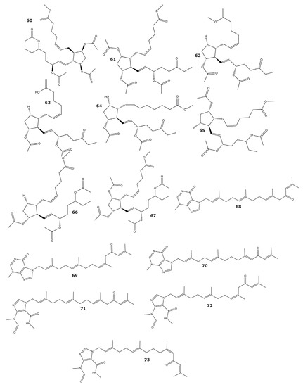 The phosphodiesterases belong to a family of enzymes that catalyze the hydrolysis of the second messengers cyclic adenosine monophosphate (cAMP) and guanosine monophosphate (cGMP) [77]. Particularly, phosphodiesterase-4 is a promising drug target for diverse diseases including inflammatory, asthma, and chronic obstructive pulmonary disease [78]. Several prostaglandins showing inhibitory activity against phosphodiesterase-4 were isolated from the soft coral Sarcophyton ehrenbergi. A number of them were novel, such as compounds sarcoehrendin B (60), D (61), F (62), H (63), and J (64), while others, including 9α,15α-diacetoxy-11α-hydroxy-5Z,13E-prostadienoic acid methyl ester (65), (5Z,9α,11α,13E,15S)-11,15-bis(acetoxy)-9-hydroxyprosta-5,13-dien-1-oic acid methyl ester (66), and 9,11,15-triacetoxy PGF2α methyl ester (67), were already known molecules (Table 4 and Figure 5) [74]. Of these compounds, 5 showed IC50 values lower than 10 µM, while the inhibitory potency for 9,11,15-triacetoxy PGF2α methyl ester (67) was comparable to that of the positive control (rolipram). Based on the results obtained in this study, several structure–function relationships were proposed. For instance, the esterification at the OH-15 seems to be essential for a strong inhibitory activity, while the acetylation of OH-9 or OH-11 produces only a minor increase in activity [74].