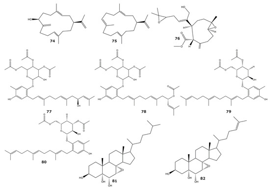 α-Glucosidase is a key enzyme in carbohydrate metabolism, which regulates blood glucose. Through controlling postprandial glucose levels, this enzyme is a validated target for the treatment of type 2 diabetes, with several available inhibitors in the market [79,80]. Two cembranoid compounds with inhibitory activity towards α-glucosidase, sinulacrassin B (74) and S-(+)-cembrane A (75), were isolated from the soft coral Sinularia crassa (Table 5 and Figure 6) [81]. Both compounds showed higher inhibitory activity than 1-deoxynojirimycin, the positive control used in the enzymatic assay. In addition, these cembranoids were nontoxic towards human normal hepatocytes (LO2), with IC50 higher than 100 µM, providing a new scaffold for the development of anti-diabetes drugs.