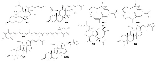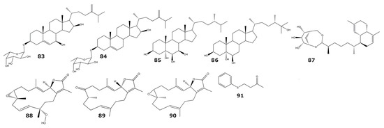 Since Tyrosine kinase p56lck participates in T cell proliferation and differentiation, its inhibitors could be used in the treatment of several inflammatory and autoimmune disorders [103]. Two sterols, with inhibitory activity towards tyrosine kinase p56lck were isolated from the soft coral Capnella lacertiliensis: 12β-acetoxyergost-5-ene-3β,11β,16-triol (92), and 11β-acetoxyergost-5-ene-3β,12β,16-triol (93) (Table 7 and Figure 8) [104].