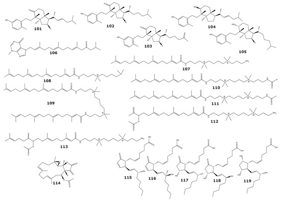 Several 9,10 secosteroids were isolated from the gorgonian Astrogorgia sp. and assessed against 16 different human tumor-related protein kinases [119]. The kinases tested were AKT1 (RAC-alpha serine/threonine-protein kinase), ALK (Anaplastic lymphoma kinase), ARK5 (AMPK-related protein kinase 5), Aurora-B, AXL (AXL receptor tyrosine kinase), FAK (Focal adhesion kinase), IGF-1R (Insulin-like growth factor 1 receptor tyrosine kinase), MEK1wt (MAP kinase 1), METwt (MET receptor Tyrosine Kinase), NEK2 (NIMA-related Kinase 2), NEK6 (NIMA-related Kinase 6), PIM1 (Serine/threonine-protein kinase PIM-1), PLK1 (Serine/threonine-protein kinase PLK1), PRK1 (Serine/threonine-protein kinase N1), SRC (Proto-oncogene tyrosine-protein kinase Src), and VEGF-R2 (VEGFR2 receptor tyrosine kinase). The compounds calicoferols A (101) and E (102), and 24-exomethylenecalicoferol E (103), 9β-hydroxy-9,10-secosteroid astrogorgol F (104), and 9α-hydroxy-9,10-secosteroid astrogorgiadiol (105) showed significant inhibition against kinases LK, AXL, FAK, IGF1-R, MET wt, SRC, and VEGF-R2 (Table 8 and Figure 9) [119]. On the other hand, 9,16 di-oxygenated molecules, such as calicoferols I and B, showed weak inhibition (IC50 > 100 µM) against these kinases, pointing to the oxygenation at the C-16 as the cause for decreased inhibitory activity. The authors of this work concluded that the 9-oxygenated 9,10-secosterol nucleus is the basis of the inhibitory activity of these compounds towards the tested kinases. Additionally, the tetraprenylated alkaloid malonganenone D (106), isolated from the gorgonian Euplexaura robusta, has shown inhibitory activity against the MET Receptor Tyrosine Kinase, or c-Met [120]. This compound had been also previously isolated from the gorgonian Euplexaura nuttingi [121].
