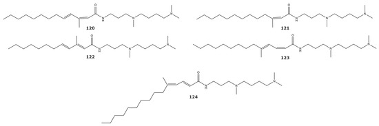 The farnesyl protein transferase is an enzyme that adds a 15-carbon isoprenoid to a cysteine amino acid of Ras protein [128]. Oncogenic mutations of Ras protein are quite common in cancer, making the protein that is involved in its post-transcriptional modification a promising way to block Ras signal transduction [129,130]. The molecule 1aR,4E,8E,11S,11aR,14aS,14bS)-1a,5,9,14a-tetramethyl-12-methylene-13-oxo-1a,2,3,6,7,10, 11,11a,12,13,14a,14b-dodecahydrooxireno[2′,3′:13,14]cyclotetradeca[1,2-b]furan-11-yl acetate (114), with inhibitory activity towards recombinant human farnesyl protein transferase, was isolated from the soft coral Lobophytum cristagalli [123]. Kinetic assays suggest that this inhibitor competes with the Ras protein, substrate of the farnesyl protein transferase. The apparent Ki value determined in this kinetic characterization was 0.17 µM. However, the same inhibitor is noncompetitive with respect to the farnesyl pyrophosphate substrate. In the same study, this compound also inhibited the enzyme geranyl protein transferase-1, closely related to the farnesyl protein transferase, but with lower potency (IC50: 5.3 µM) [123].