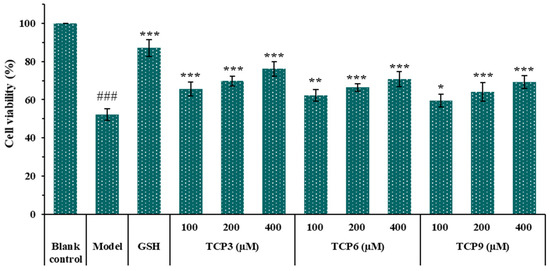 Effects of antioxidant peptides TCP1-TCP11 on the viability of UVB-irradiated cell model. Glutathione (GSH) at 200 µM was served as the positive control. All data are presented as the mean ± SD of triplicate results. ### p < 0.001 vs. blank control group; *** p < 0.001 and * p < 0.05 vs. model group.