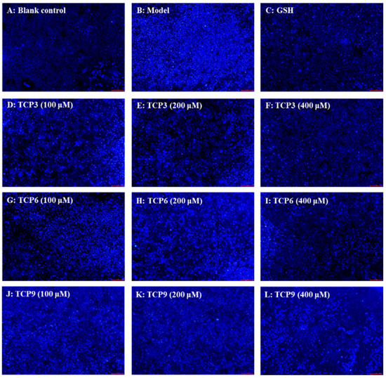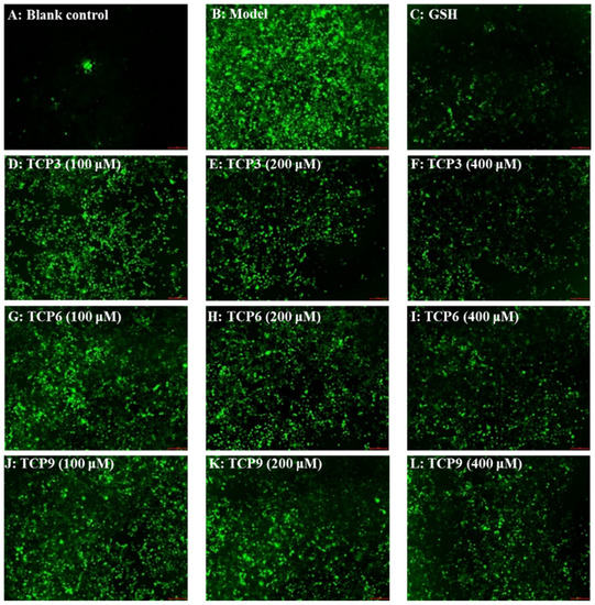 Determination of ROS content in cells by DCFH-DA staining. Glutathione (GSH) at 200 µM served as the positive control. (A) Control; (B) UVB-irradiated HaCaT cell model; (C) GSH; (D–F) TCP3 with 100, 200, and 400 μM, respectively; (G–I) TCP6 with 100, 200, and 400 μM, respectively; (J–L) TCP9 with 100, 200, and 400 μM, respectively.