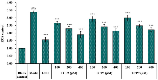 Effects of different concentrations (100, 200, and 400 µM) of TCP3 (PKK), TCP6 (YEGGD) and TCP9 (GPGLM) on ROS levels of UVB-irradiated HaCaT cell model. Glutathione (GSH) at 200 µM was served as the positive control. All data are presented as the mean ± SD of triplicate results. ### p < 0.001 vs. blank control group; *** p < 0.001 vs. model group.