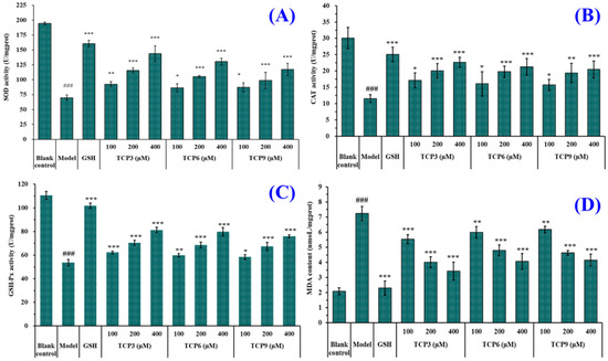 Effects of different concentrations (100, 200, and 400 µM) of TCP3 (PKK), TCP6 (YEGGD) and TCP9 (GPGLM) on the levels of SOD (A), CAT (B), GSH-Px (C), and MDA (D) in UVB-irradiated HaCaT cell model. Glutathione (GSH) at 200 µM was served as the positive control. All data are presented as the mean ± SD of triplicate results. ### p < 0.001 vs. blank control group; *** p < 0.001, ** p < 0.01, and * p < 0.05 vs. model group.