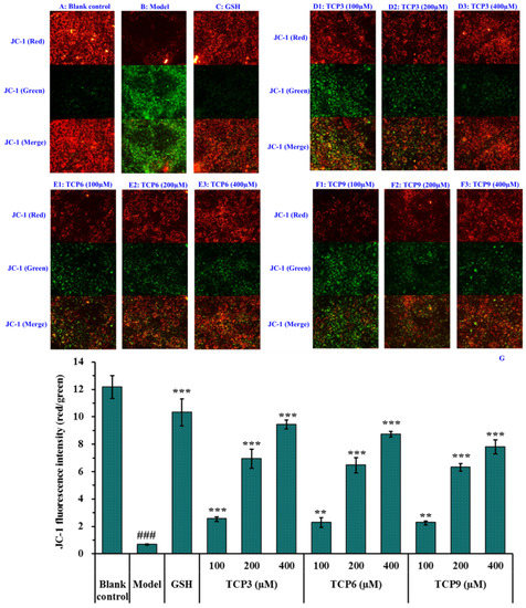 Effects of TCP3 (PKK), TCP6 (YEGGD) and TCP9 (GPGLM) on the mitochondrial membrane potential (MMP) of UVB-irradiated HaCaT cell model. Glutathione (GSH) at 200 µM served as the positive control. (A) Control; (B) UVB-irradiated HaCaT cell model; (C) GSH; (D1–D3) TCP3 with 100, 200, and 400 μM, respectively; (E1–E3) TCP6 with 100, 200, and 400 μM, respectively; (F1–F3) TCP6 with 100, 200, and 400 μM, respectively; (G) JC-Fluorescence intensity (red/green). All data are presented as the mean ± SD of triplicate results. ### p < 0.001 vs Control group; *** p < 0.001, ** p < 0.01 vs UVB-irradiated HaCaT cell model.