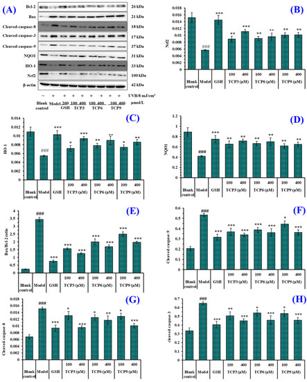 Effect of TCP3 (PKK), TCP6 (YEGGD) and TCP9 (GPGLM) on expression of antioxidant and apoptosis related proteins in UVB-irradiated HaCaT cell model. Glutathione (GSH) at 200 µM was served as the positive control. (A) Western-Blot; (B) the protein expression of Nrf2; (C) the protein expression of HO-1; (D) the protein expression of NQO1; (E) Bax/Bcl-2 ratio; (F) the protein expression of Cleaved-caspase-9; (G) the protein expression of Cleaved-caspase-8; (H) the protein expression of Cleaved-caspase-3. All data are presented as the mean ± SD of triplicate results. ### p < 0.001 vs. control group; * p < 0.05, ** p < 0.01, and *** p < 0.001 vs. UVB-irradiated HaCaT cell model.