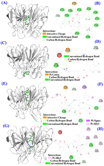 Keap1 (MW 70 kDa) is a cysteine-rich protein and consists of more than 625 amino acid residues, including 27 cysteine residues. The Kelch domain of Keap1 is combined with the Neh2 domain of Nrf2 [45,46]. The binding sites of Keap1 in the Kelch domain can be divided into five sub-pockets, namely P1 (Arg415, Ile461, Gly462, Phe478, Arg483 and Ser508), P2 (Ser363, Arg380, Asn382 and Asn414), P3 (Gly509, Ser555, Ala556, Gly571, Ser602 and Gly603), P4 (Tyr525, Gln530 and Tyr572), and P5 (Tyr334 and Phe577) [45,46]. Bioactive peptides bind to other macromolecular substances mainly through hydrogen bond force, van der Waals force and electrostatic interaction force, among which hydrogen bond force is the most important [27,47]. The molecular docking analysis indicated that the affinity of TCP3 with the middle cavity and bottom of Kelch domain was −7.4 kcal/mol and −6.6 kcal/mol, which was similar to those of TCP6 (−8.9 kcal/mol) and TCP9 (−8.5 kcal/mol) interacted with the middle cavity of Kelch domain. These data indicated that TCP3 (PKK), TCP6 (YEGGD) and TCP9 (GPGLM) could bind to Keap1 protein. Figure 11A,B indicated TCP3 (PKK) formed hydrogen bonds with Val418, Val465, Val512, Ala510, Leu557, Gly364, Leu365, Ile416, Val606, Gly367, and Gly464 residues when TCP3 (PKK) interacted at the middle cavity of the Kelch domain and interacted with Arg415 residues of Kelch domain by electrostatic force. In addition, TCP3 (PKK) formed hydrogen bonds with Ser508 and Arg380 residues when TCP3 (PKK) interacted at the middle cavity of the Kelch domain and interacted with Phe478 residues of Kelch domain by electrostatic force (Figure 11C,D). Figure 11E,F showed that TCP6 (YEGGD) formed hydrogen bonds with Cys513, Val465, Val512, and Ala556 residues, interacted with Val420 and Cys368 residues through hydrophobic effect, and acted with Arg415 residue by electrostatic force when it interacted at the middle cavity of the Kelch domain. Figure 11G,H showed that TCP9 (YEGDP) formed three hydrogen bonds with Val418, Val604, and Gly419 residues, and interacted with Ala466, Cys513, Val514, Val512 and Val465 residues through hydrophobic effect when it interacted at the middle cavity of the Kelch domain. In summary, TCP3 (PKK) and TCP6 (YEGGD) occupy the amino acid residues Arg380, Arg415 and Arg415 Ala556 that have an impact on Keap1-Nrf2 interaction, respectively, so it could be concluded that TCP3 and TCP6 can competitively inhibit Nrf2 binding. However, TCP9 (GPGLM) could not bind to the active site of the Kelch domain of Keap1 protein, which was inferred to be non-competitive inhibition.