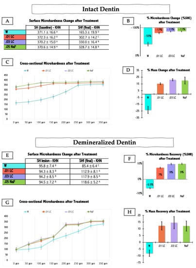 The two panels in Figure 1 show the outcomes relative to intact (upper panel—Figure 1A–D) and caries-challenged (pre)demineralized (lower panel—Figure 1E–H) enamel samples upon treatment with the remaining skeleton of LC in two concentrations, in comparison to positive (0.05% sodium fluoride—NaF) and negative (water—W) controls. The effect of enamel treatment was tested on the variables: surface microhardness change (%SHC) of intact enamel, surface microhardness recovery (%SHR) of (pre)demineralized enamel, and cross-sectional hardness and mass variation (%Mass change or %Mass Recovery) of both intact and (pre)demineralized enamel samples.