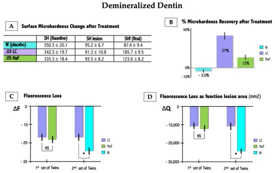 There were no adverse reactions reported by participants while undergoing study protocols. Similarly, there were no effects of study protocols on oral tissues. Surface hardness recovery (%SHR) and quantitative induced-fluorescence (QLF) measurements are summarized in Figure 2. %SHR of demineralized samples treated with LC 0.03% was significantly higher when compared to positive control NaF 0.05% (p < 0.05) (Figure 2A). Likewise, LC 0.03% solution was significantly more effective in increasing surface hardness of chemically demineralized enamel than placebo solution (p < 0.01) (Figure 2B). QLF parameter delta F (∆F) refers to the amount of fluorescence signal which allows for quantitation of mineral loss, while delta Q (∆Q) is derived from the product of ∆F (in %) multiplied by the lesion area. The treatment of demineralized enamel for the first set of twins showed no statistical difference between LC and NaF groups for ∆F and ∆Q values (Figure 2C,D) (p > 0.05); although, there was a tendency for improvement in ∆F and ∆Q values in the LC group when compared to NaF. Conversely, a remarkable difference was observed for the second set of twins who rinsed with LC or W (placebo), where it was seen that ∆F and ∆Q (Figure 2C,D) values for the LC group were significantly lower than for the group who rinsed with water (p < 0.05).