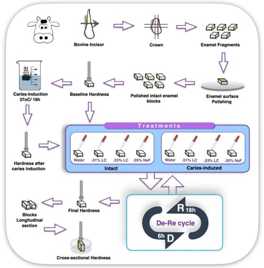 Illustrative schematic of experiment 1—In vitro study. Sequence shows the sectioning of bovine tooth; obtained enamel fragments; enamel surface polishing; enamel surface baseline hardness measurement; chemical induction of caries lesion (demineralization) of half of total sample, while the other half remained intact; surface hardness of demineralized samples; treatment of intact and demineralized samples with Water; 0.01%LC, 0.03% LC or 0.05% NaF; samples demineralization–remineralization cycle (De–Re cycle) for 6 days; enamel surface final hardness; longitudinal sectioning of samples for cross-sectional hardness measurements; and samples cross-sectional hardness measurements.