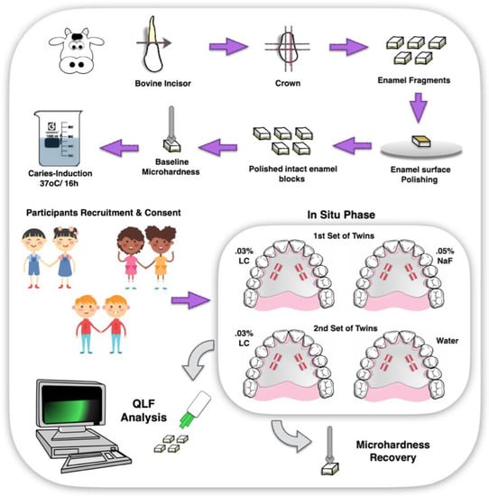 Illustrative schematic of experiment 2—in situ/ex vivo co-twin control study. Sequence shows the sectioning of bovine tooth; obtained enamel fragments; enamel surface polishing; enamel surface baseline hardness measurement; enamel chemical lesion induction (demineralization); participants recruitment and consent; preparation of intraoral appliances for in situ phase; in situ phase in two sets of twins for comparsion of treaments 0.03% LC × 0.05% NaF and 0.03% LC × water; removal of enamel blocks from intraoral appliances after in situ phase; QLF measurements.