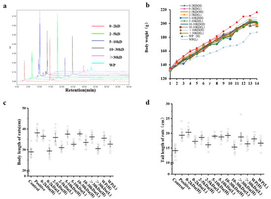 Furthermore, the body length results showed that the body length of each animal in the high-dose group was significantly different from that of the control group (Figure 1c). Moreover, among the experimental groups, the rats in the 10–30 kDa group possessed the longest body length (p < 0.05). When compared with the control group, the tail length results showed that there were significant differences in the tail lengths of the rats in each high-dose group, except in regard to the >30 kDa group. Furthermore, the tails of the rats in each low-dose group were shorter than those in the corresponding high-dose group (Figure 1d). In conclusion, the body weight, body length, and tail length of the rats were positively correlated with the concentration of each sample.