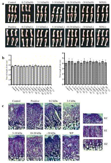 Generally, changes in the length of the femur and tibia are indicators that directly reflect the growth of long bones in rats. As such, in order to avoid the influence of water and excess muscle tissue in regard to bone weight, the right femur of each rat was weighed. According to the results, the femur and tibia lengths of the rats in the 10~30 kDa (H) group were the longest (p > 0.05) (Figure 2a,b). Furthermore, the growth of long bones in rats is mainly accomplished by endochondral ossification, which is the development of growth plates in the metaphysis of the long diaphysis.