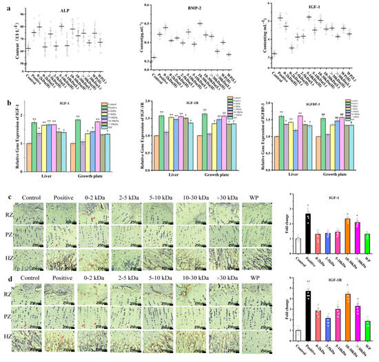 Quantitative RT-PCR was used in order to detect the mRNA expression levels of IGF-1, insulin-like growth factor-1 receptor (IGF-1R), and insulin-like growth factor binding protein 3 (IGFBP-3) in the Wistar rat tibial growth plates and livers (Figure 3b). When compared with the control group, the expression levels of IGF-1 mRNA in the liver of the rhGH group, 2–5 kDa group, and 10–30 kDa group were significantly increased (p < 0.01); moreover, the 5–10 kDa group, >30 kDa group, and the WP group also showed higher expressions than the control group (p < 0.05). In regard to the rat epiphyseal growth plate, the 2–5 kDa group, the 5–10 kDa group, and the WP group, an upregulated expression of IGF-1 mRNA (p < 0.05) was shown.
