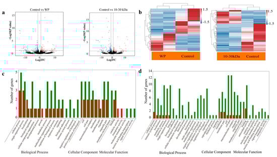 When compared with the control group, the rats in the WP group had 130 differentially expressed genes (DEGs), of which 53 genes were upregulated, and 77 genes were downregulated, as shown in Figure 4a (left). The genes expression level in the WP group are shown in Figure 4b (left). When compared with the control group, 145 DEGs were identified in the 10–30 kDa group, including 47 upregulated genes and 98 downregulated genes, as shown in Figure 4a (right). The relative levels of gene expression in the 10–30 kDa group are shown in Figure 4b (right). As shown by the Gene Ontology (GO) analysis, the differential expression of the genes in the femur transcriptome of rats in the WP group, as well as the 10–30 kDa group, aggregated into biological processes and cellular components after 14 days of treatment (Figure 4c,d).