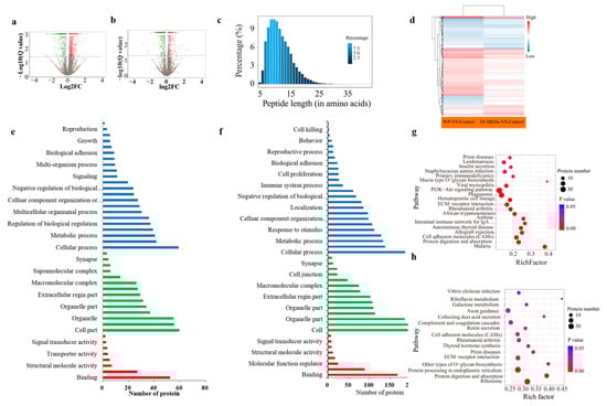 Comparative total proteomics of rats in the WP group and the 10–30 kDa group when compared with the control group. (a) Diagram of the total proteins from rat femur tissue in the purified WP group; (b) diagram of total protein from rat femur tissue in the purified 10–30 kDa group; (c) the percentage of each different peptide length; (d) clustering analysis of the DEPs in the comparisons of control group vs. 10–30 kDa group, as well as control group vs. the whole plasma group. Blue indicates downregulation, red indicates upregulation, and white indicates no detectable change in expression; (e) GO analysis of the DEPs for femur proteomics of the rats in the WP group; (f) GO analysis of the DEGs for femur proteomics of the rats in the 10–30 kDa group (blue indicates molecular function, green indicates cellular component, and red indicates biological process domains); (g) statistics of the pathway enrichment of the differentially expressed proteins in the control group vs. whole plasma group comparison; and (h) statistics of pathway enrichment of the differentially expressed proteins in the control group vs. the 10–30 kDa group comparison. RichFactor is the ratio of the number of differentially expressed proteins annotated in this pathway term with respect to the number of all proteins annotated in this pathway term.