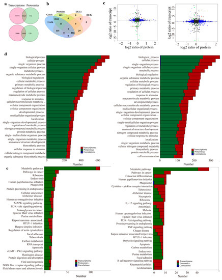 Combined proteomics and transcriptomics analyses. (a) Venn diagram of the expressed genes and proteins in the control group vs. the whole plasma group, as well as control group vs. the 10–30 kDa group comparisons; (b) comparison of all genes, proteins, DEGs, and DEPs in the control group vs. the whole plasma group (left), as well as control group vs. the 10–30 kDa group samples (right); (c) four-quadrant diagram of control group vs. the whole plasma group (left), as well as control group vs. the 10–30 kDa group (right) comparisons. (Each dot represents one gene/protein; black dots represent nondifferentiated proteins and genes; green dots represent DEGs but not the non-DEPs; blue dots represent DEPs but not the non-DEGs; and red dots represent both DEGs and DEPs with the same difference trend); (d) pathway analysis of the DEGs (left) and DEPs (right) from rat femurs; (e) Pathway correlation analysis in the control group vs. the whole plasma group (left), as well as control group vs. the 10–30 kDa group (right) comparisons.