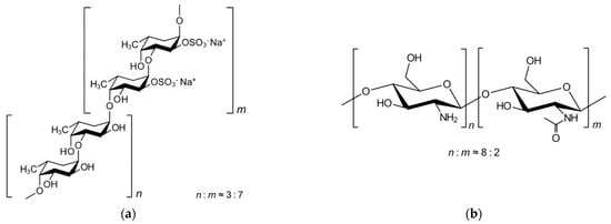 Earth and marine materials are important sources of compounds that can be used in different areas of human life. Whilst the first type has been widely explored, those of marine origin have been gaining interest recently regarding their potential use in different domains ranging from food-related industries to biomedical applications. Among those, algae, and especially brown seaweeds, have been studied as possible sources of several bioactive materials, namely fucoidan, one of their main compounds, first studied in 1913 [1]. This complex sulphated polysaccharide can be extracted from Fucus vesiculosus (order Fucales), an example of edible brown seaweed. One of the limitations entailing the use of natural sources concerns the abiotic factors that, although not exclusively, affect the final chemical composition of the algae [2,3]. The characterisation of the extracted materials proves essential in understanding general behaviours and interactions with other compounds, as well as the possible applications. Fucoidan is mainly comprised of fucose residues and sulphate groups (Figure 1a). Whereas its specific structure may be highly variable depending on the source, the structural position of sulphate groups has been correlated with the resulting biological activity, including antioxidant and antitumoral capabilities, as well as with the applications, including in drug delivery [4,5]. Furthermore, other possible therapeutic approaches can be envisaged, mainly focusing on the pharmacological potential of fucoidan that has been described elsewhere [6,7,8]. In this regard, fucoidan from F. vesiculosus has been the most frequently reported and inclusively categorized as GRAS (generally recognized as safe) by the FDA (Food and Drug Administration) [9], showing an antiproliferative effect that might be useful in drug delivery approaches. In this context, polysaccharides have been finding great applications as a matrix of drug carriers, frequently playing multifunctional roles. Polymeric nanoparticles are one of many proposed carriers, requiring different methods for their preparation, which are highly dependent on the used materials. Polyelectrolyte complexation finds frequent application when charged excipients are at play, and many polysaccharides provide the necessary ionic character. The technique relies on the interaction of opposite charges, thus involving ionic interactions [10]. In this context, chitosan (CS), also of marine origin, is widely chosen as a counterion, as it is comprised of N-acetylglucosamine and D-glucosamine units (Figure 1b), gaining a unique cationic character in acidic media, a chemical structure already studied and seen elsewhere [11]. Due to its favorable properties, CS has been proposed as a component in the matrix of countless pharmaceutical formulations [12,13]. The production of fucoidan/chitosan nanoparticles was reported on several occasions, aiming at applications mostly in the context of drug delivery and tissue regeneration [9].