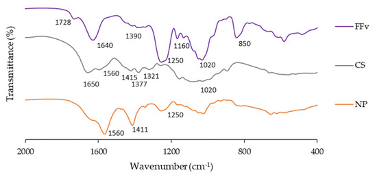 The nanoparticle formulation FFv/CS = 2/1 (w/w) was also analysed by FT-IR, following the indications detailed in Section 2.3.
