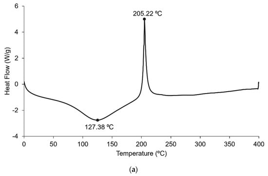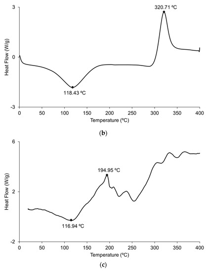 The behaviour of FFv is shown in Figure 4a, where two major peaks were observed at 127 °C and 203 °C. The first peak is possibly related to the loss of water associated with the polymer, whilst the second is a highly exothermic peak, which is suggested to be related to the polymer degradation during the heating process. Both peaks are coincident with reports in the literature [29], suggesting an amorphous state. The diagram corresponding to CS (Figure 4b) is similar to that of FFv regarding the presence of a peak attributable to the loss of water around 118 °C and an exothermal peak at 320 °C indicating the degradation of CS amine groups, as reported in the literature [30], again suggesting an amorphous state. As for the nanoparticle formulation of FFv/CS = 2/1 (w/w), two peaks are shown at around 117 °C and 195 °C. The first one is attributed to the loss of water, as discussed earlier, and it has a temperature similar to that found for CS. The second one, at a higher temperature, is often associated with polymer degradation. This second peak is close to that observed for FFv, which was correlated with the temperature at which this polymer degrades. Moreover, although it is not too intense, there is a peak above 300 °C, which is the degradation temperature of CS. Considering the data obtained for the nanoparticle formulation, it is highly suggested that the mixture of these two polymers that result in nanoparticle formulation will have similar thermal behaviour to the polymers that were originally used.
