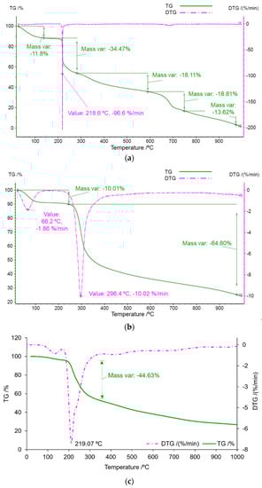 The observations pertaining to CS (Figure 5b) were somewhat similar to those of FFv, as was also verified in DSC. An important variation in mass was detected around 300 °C, with a total variation in the mass of approximately 75% upon reaching the end of the analysis. At this temperature, the amine is degraded and, thus, so is the polymer [30]. In the analysis performed for the nanoparticle formulation of FFv/CS 2/1 (w/w), a great mass variation of −44.63% was observed at around 219 °C, a temperature that was closer to the one obtained for FFv because it is the polymer that is in a higher amount by comparison with chitosan. This result complements the one obtained in the DSC graphs, as it is at this temperature that the fucoidan starts to degrade, justifying the mass variation.