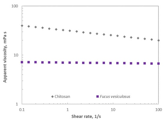 CS is a strong viscosity-building agent, whereas crude fucoidan has limited potential as a techno-functional agent [32]. The understanding of the rheological behaviour of this polysaccharide is relevant during processing to expand its potential applications. Figure 6 presents the flow curves for the tested polymer solutions (2%, w/v) at 25 °C. FFv exhibited Newtonian behaviour, whereas the CS solution presented non-Newtonian behaviour. This is consistent with the literature, which reports Newtonian behaviour for a number of fucoidans extracted from different brown seaweeds (i.e., Saccharina longicruris, Ascophyllum nodosum, and F. vesiculosus) using selective solvents [33]. The shear thinning behaviour observed for CS samples can be adequately described (R2 > 0.99) by the power law model, and the apparent viscosity drop is in good agreement with a characteristic non-entangled polymer trend in the dilute regime [34]. As expected, higher apparent viscosities were found for CS (around 6-fold at the lowest shear rates) than for the tested fucoidan solutions. The behaviour associated with the shear rate of FFv is consistent with the obtained lower molecular weight profile since the lower molecular weights identified for FFv can involve smaller flow resistance, as previously reported for other fucoidans [35]. Other authors explained that the viscosity variations between the different fucoidans were closely dependent not only on the molecular weight but also on the content and positions of sulphate groups and uronic acids [33]. It is noteworthy that thixotropic character was not identified in any of the tested samples, under the evaluated experimental conditions, with the consequent benefit for its application.