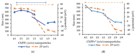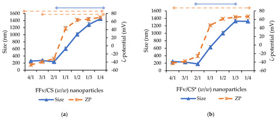 The effect of adjusting the pH of polymeric solutions to 4 before the nanoparticle assembly occurred was tested to verify its effect on nanoparticle characteristics. The importance of pH adjustment was associated with the chemical structure of CS. The pKa of the amine groups was 6.5, which underwent protonation in acidic environments; thus, in these situations, its degree of ionization occurred in increments. An overall increase in protonated amines led to increased availability for interactions with groups of opposite charges, leading, in theory, to an increased yield of nanoparticles [39]. In fact, although some punctual, statistically significant differences may apply, the profiles of size evolution did not vary significantly when the pH was previously adjusted compared to non-adjusted conditions. Focusing on the smaller-sized nanoparticles, the dimensions remained in the same size range: around 250 nm for FFv/CS nanoparticles and 320 nm for CS/FFv nanoparticles. An important feature concerning the size of the nanoparticles is the polydispersity index (PdI), which is indicative of homogeneity. Both FFv/CS and CS/FFv nanoparticles displayed a PdI between 0.2 and 0.4, which is considered acceptable, particularly because natural polymers are being used.