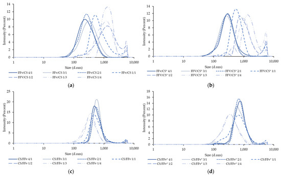 Size distribution by the intensity of nanoparticle formulations: (a) FFv/CS, (b) FFv/CS*, (c) CS/FFv, and (d) CS/FFv* at different ratios from 4/1 to 1/4 (w/w). CS: chitosan; FFv: fucoidan from Fucus vesiculosus; * pH adjustment.