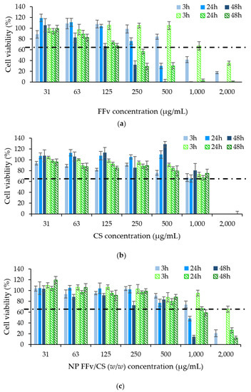 The maximal inhibitory concentration (IC50) was calculated for both FFv and the nanoparticle formulation (Table 3). For CS, although showing results below 50% of cell viability, this result was not determined, as the cell impact was attributed to the solvent.