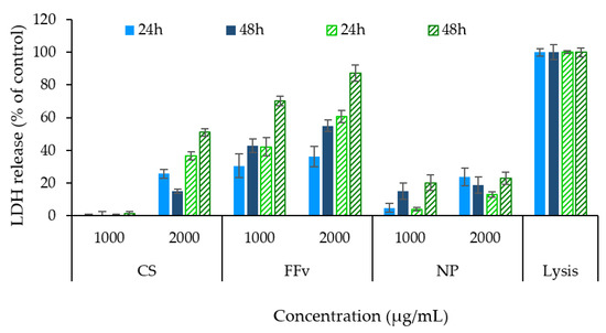 The assessment of the antiproliferative effect of the tested polymers and nanoparticle formulation was further complemented through the determination of the cytoplasmic enzyme, LDH, released in the incubation medium, as a consequence of cell membrane disruption. A high amount of LDH released thus correlates with a high level of cell death. The highest concentrations tested in the previous assay (1000 and 2000 µg/mL) were those evaluated, and the obtained results are depicted in Figure 11.