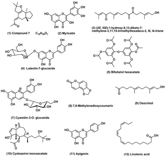 Metabolic profiling of three algal species, C. myrica, C. trinodis, and C. tamariscifolia methanol fraction, was achieved using UPLC/ESI/MS analysis (Supplementary Figures S1–S3). Twelve compounds with different concentrations were annotated in the methanol fraction of the three Cystoseira species. Most of them belonged to the class of terpenoids and flavonoids (Table 1). Compounds were tentatively identified based on the mass of the molecular ion peaks and comparison with bibliographic references, as shown in (Table 1). On the one hand, a major meroditerpenoid with molecular formula C18H26O2 (1) and with a mass ion peak at m/z 273 was identified in C. myrica and C. tamariscifolia, and it was previously reported from C. baccata [41]. Acyclic diterpene (2E, l0E)-1-hydroxy-6,13-diketo-7- methylene-3,11,15-trimethylhexadeca-2,l0,l4-triene (3) with mass ion peak at m/z 317 identified in C. tamariscifolia and previously reported from C. crinite [42]. A phlorotannin with a mass ion peak at m/z 517 and molecular formula C24H22O13 was identified as bifuhalol hexacetate (5) in C. myrica. Oxocrinol (9) was identified as a linear terpenoid with a mass ion peak at m/z 223 and molecular formula C14H24O2 in C. tamariscifolia, and it was previously reported from C. crinite [43]. Hydroazulene diterpene cystoseirol monoacetate (10) with mass ion peak at m/z 397 and molecular formula C22H36O5 identified in the three algal extracts, and it was previously isolated from C. myrica [44]. Moreover, α-linolenic acid (12) with a mass ion peak at m/z 277 was identified in C. tamariscifolia. Linolenic acid was previously identified in C. compressa and C. indica extracts [31,45].