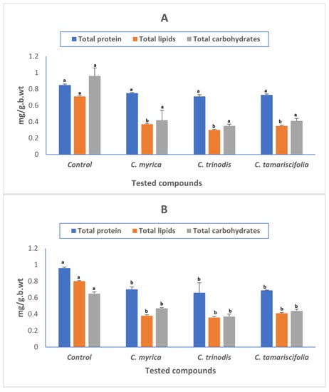 Effect of Cystoseira myrica, C. trinodis, and C. tamariscifolia extracts on biomolecules availability in Culex pipiens 3rd instar larvae 24 h (A), 48 h (B) post-treatment. (a,b) Different letters indicate that the mean is significantly different from control at p < 0.05.