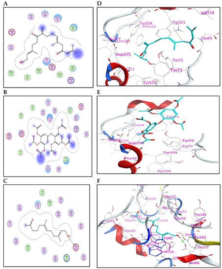 (A–C) The 2D-binding interaction profile for compounds 10, 12, and λ-cyhalothrin, respectively, with the pocket of GST protein. (D–F) In-depth 3D ligand-GST interaction mode for compounds 10, 12, and λ-cyhalothrin, respectively.