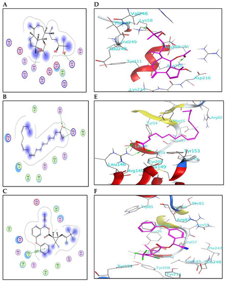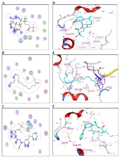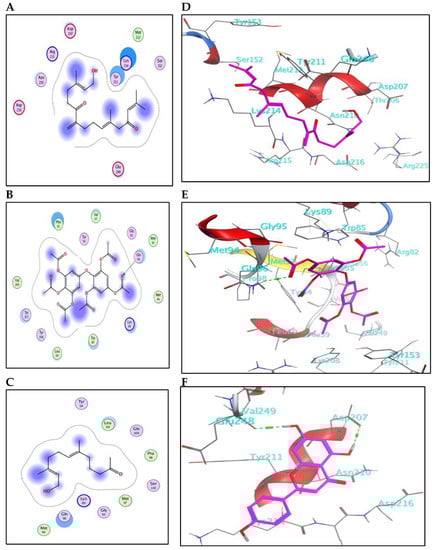 (A–C) The 2D-binding interaction profile for compounds 3, 5, and 9, respectively, with the pocket of GST protein. (D–F) In-depth 3D ligand-GST interaction mode for compounds 3, 5, and 9, respectively.