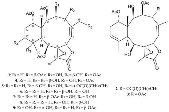 - Huynh, T.H.; Wen, Z.-H.; Chien, S.-Y.; Chung, H.-M.; Su, J.-H.; Fang, L.-S.; Wu, Y.-J.; Lin, S.-H.; Sung, P.-J. Briavioids A–C, discovery of new polyacetoxybriaranes from octocoral Briareum violaceum (Quoy & Gaimard, 1833). Tetrahedron 2022, 125, 133037. [Google Scholar]