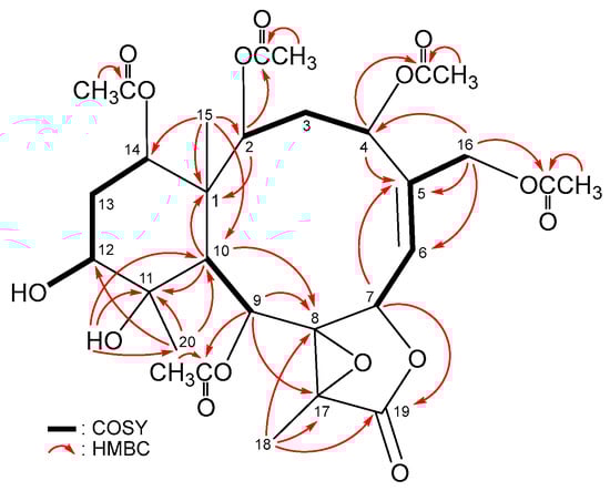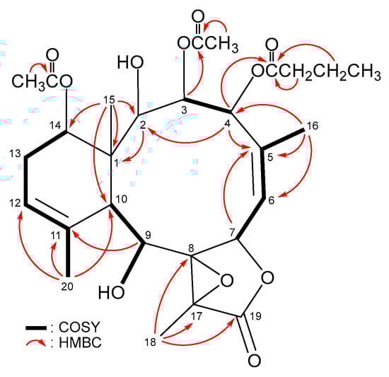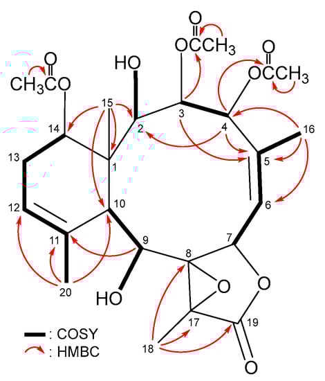 The planar structure of 3, including the positions of OAc-3, OAc-4, OAc-14, OH-2 and OH-9 then was clearly confirmed by analyzing the COSY and HMBC spectroscopic data (Figure 6). Based on the NMR data of 2 and 3, the stereochemistry of 3 should be similar to the configuration of 2. It then was further confirmed by the combined interpretation of the NOESY correlation and modeling structure (Figure 7). The configuration of 3 was identified as (1R*,2R*,3R*,4R*,7S*,8R*,9S*,10S*,14S*,17R*).